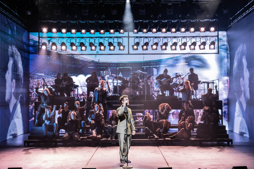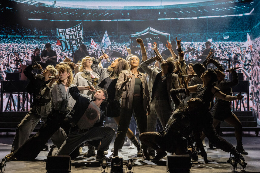 The set by Souter Gilmore, is simple but clever. A double row of seats to suggest stadium bleachers in front of a raised platform housing the incredibly talented (and loud) six-piece band. Furniture is pushed on and off, with precision, by the hard-working cast, seamlessly choreographed by Ebony Molina. The costumes by Fay Fullerton are all monochrome or muted khaki so the ensemble can blend into the background and not pull focus from the action. Howard Hudson’s light design takes us from intimate interiors to hot dusty landscapes and the stadium’s blinding wall of light, to match Gareth Owen’s wall of sound (bone rattling at times).
