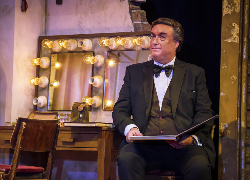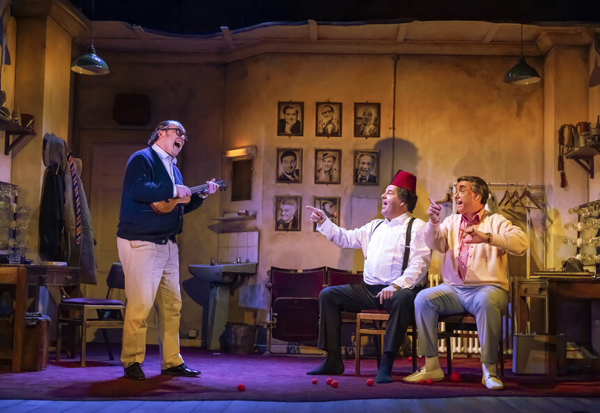 The creative team worked their magic to bring all the elements together. Lee Newby’s atmospheric set is a run down, small dressing room with damp on the walls, very old posters promoting long-past Laurel and Hardy and Harry Secombe shows. A wall of framed photos features late, great comedy legends, many of whom are referred to in the show.